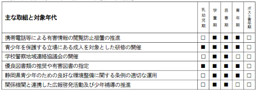 主な取組と対象年代の表における「優良図書類の推奨や有害図書の指定」の青年期が■(核となる対象年代)となっているが、静岡県青少年のための良好な環境整備に関する条例によれば、本施策は青少年(当該条例における定義は18歳未満)向けの施策であり、青年期およびポスト青年期はブランクとするべきである。 有害図書が18歳以上にとって有害であるとの誤った認識を与えかねない。